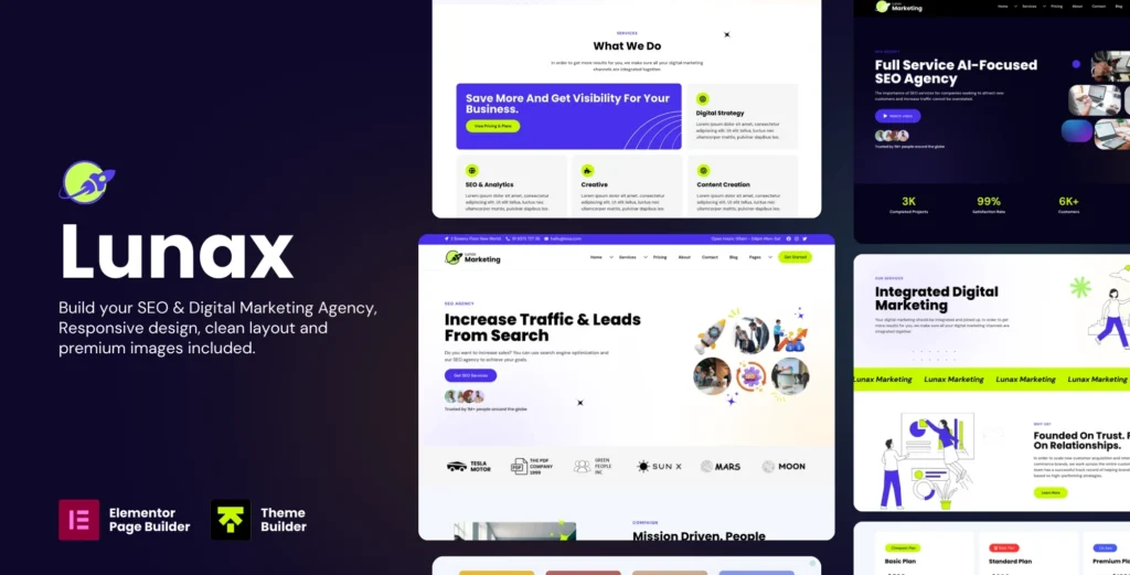 Lunax – Digital Marketing Agency WordPress Theme is a sleek, futuristic, and highly versatile theme built for digital marketers, creative agencies, SaaS startups, and branding studios. Designed with Elementor, Lunax offers a modern, visually engaging layout that’s both easy to customize and optimized for performance.